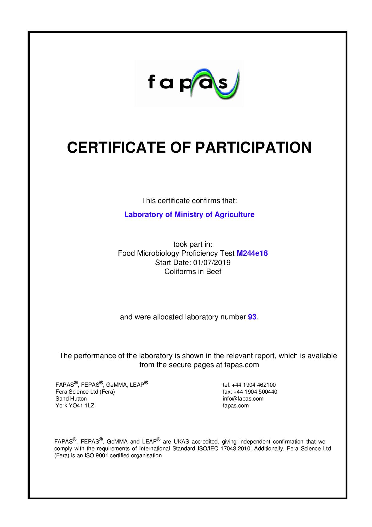 FAPAS certificate on Stapyloccoci in Milk Powder