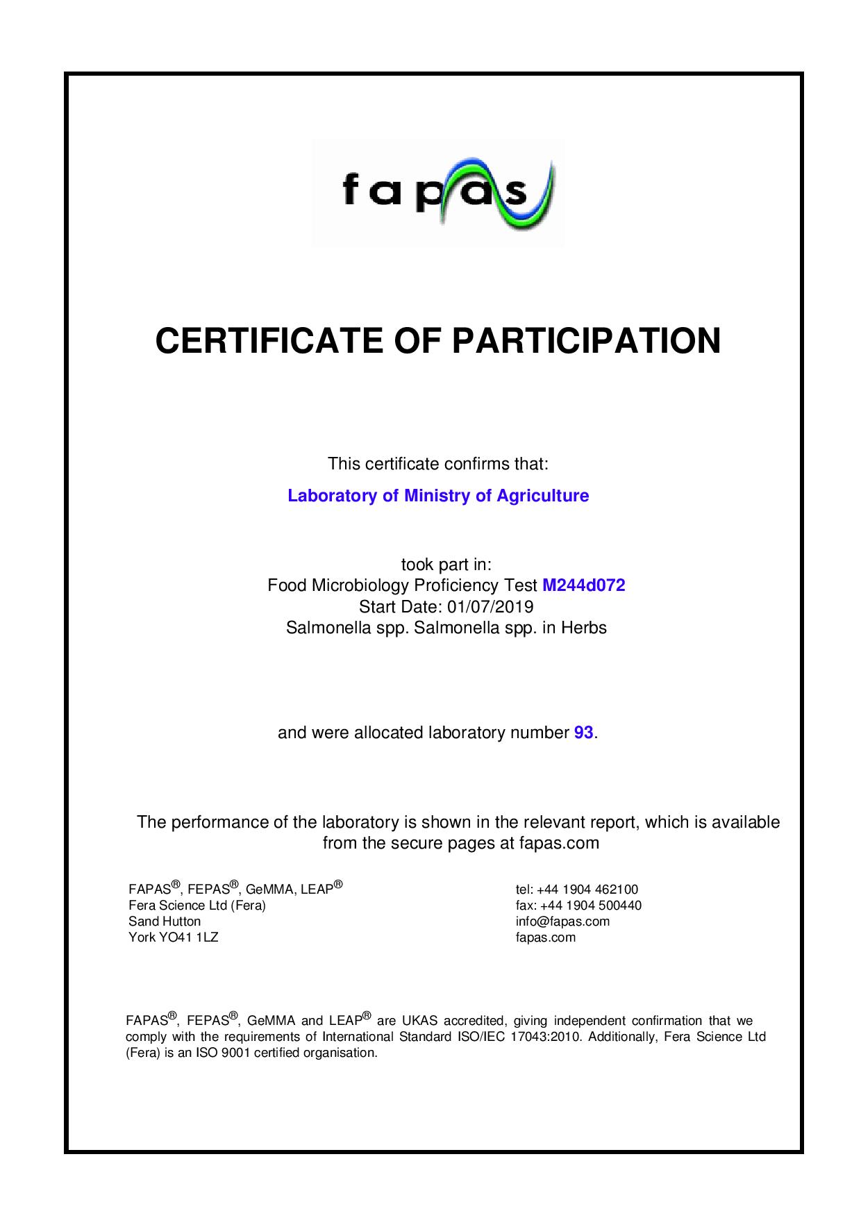 FAPAS-ის სერტიფიკატი სტაფილოკოკის აღმოჩენის მახასიათებელზე რძის ფხვნილში