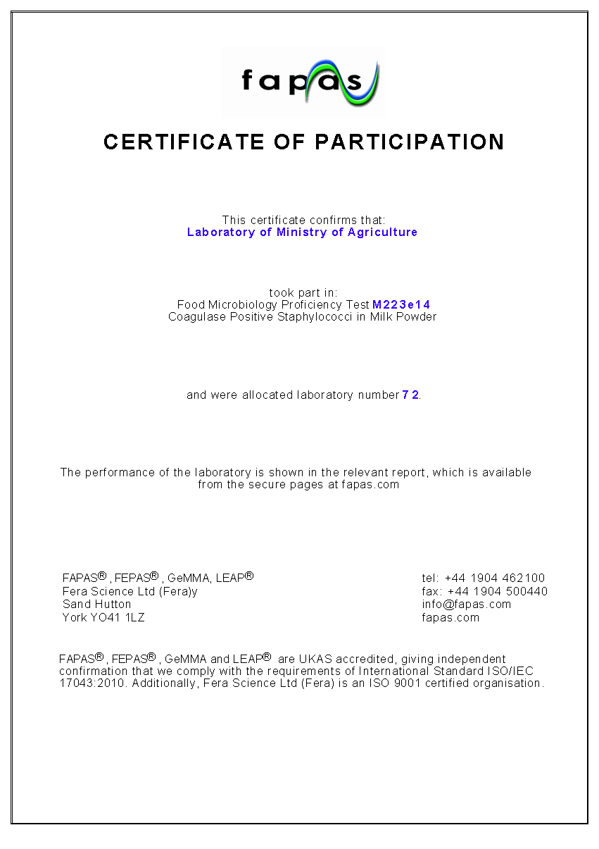 FAPAS-ის სერტიფიკატი სტაფილოკოკის აღმოჩენის მახასიათებელზე რძის ფხვნილში